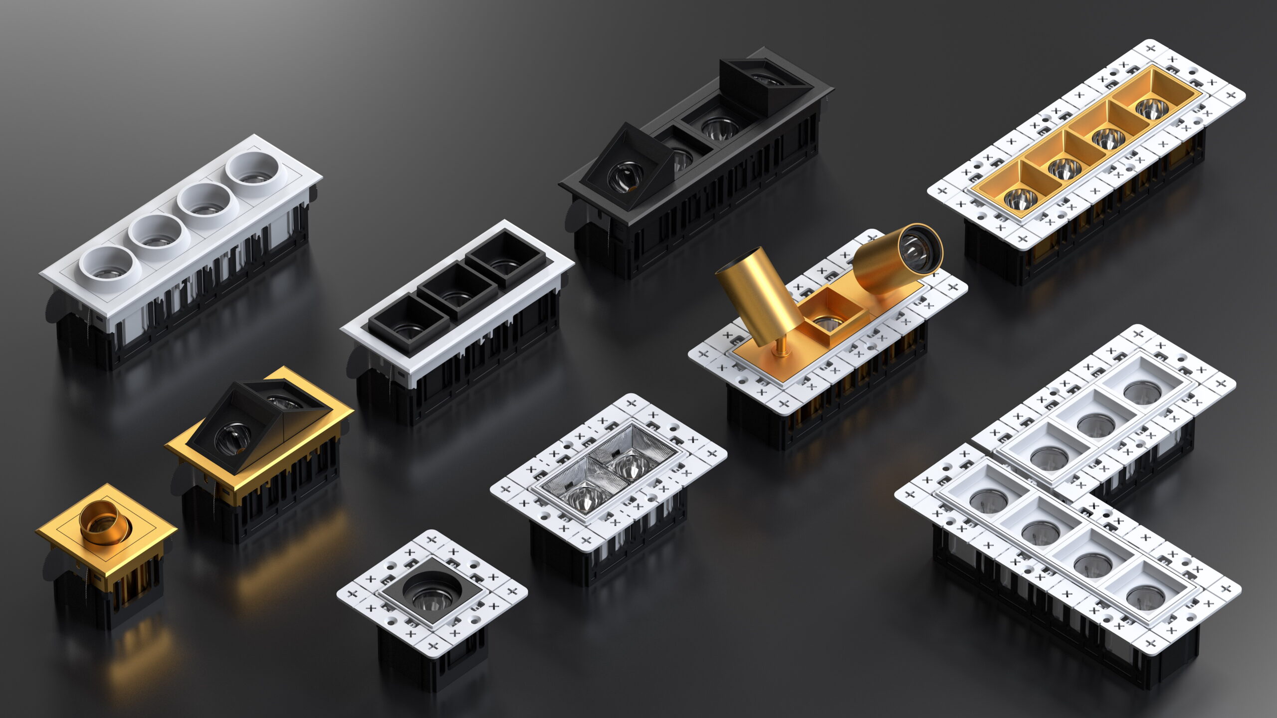 Kassettene er produsert i en kombinasjon av POM og aluminium som gir både lav vekt, høy stabilitet og et svært nøyaktig innfellingsresultat. Den innvendige konstruksjonen er designet for enkel montering av spotmodulene, og sørger for at hver modul klikker sikkert på plass uten bruk av løse skruer. Dette gjør det enkelt å tilpasse, oppgradere eller bytte moduler over tid.